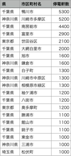 10月17日:千葉県の地域的な停電は解消されました。最終更新分は参考として残しておきます。 10月16日6時:現在も千葉県内で2,200軒、神奈川なども含め5,400軒で停電が続いています。解消地域の避難所等の情報は削除していきます。 10月13日17時:現在も千葉…